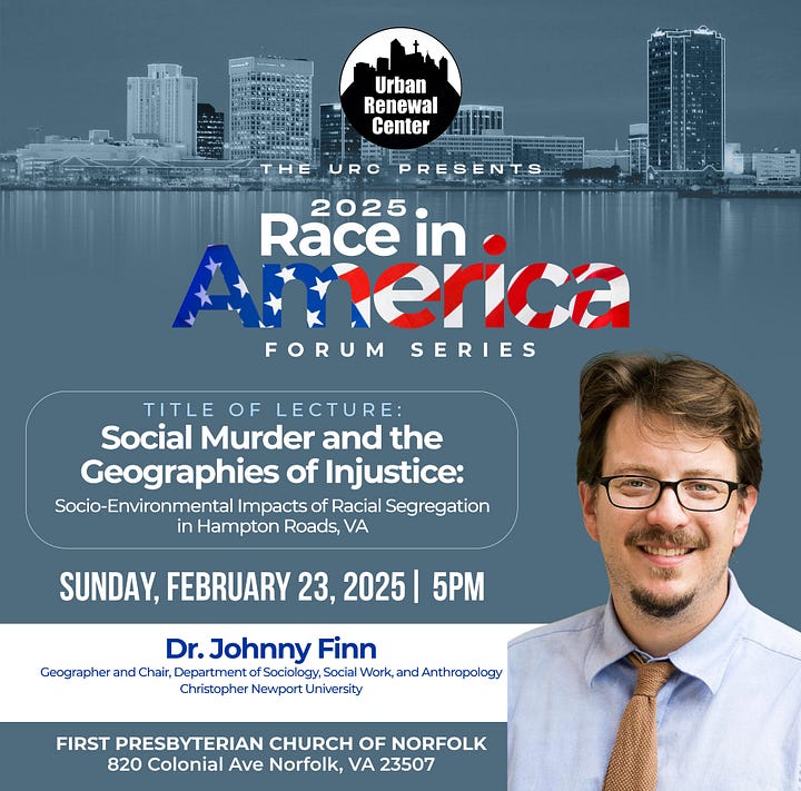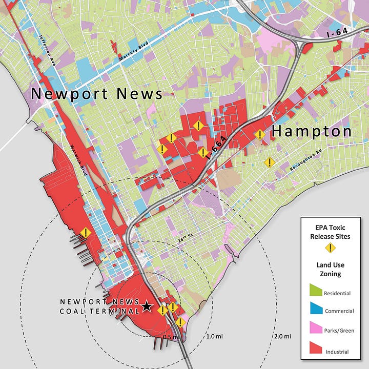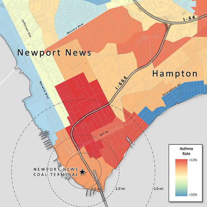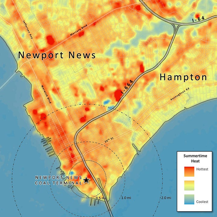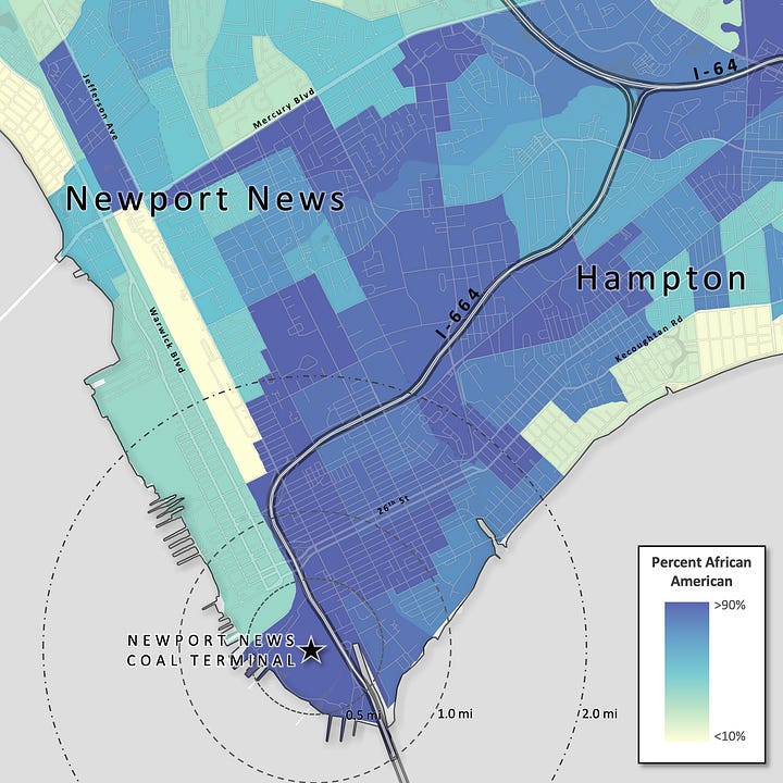 Last summer I was invited to speak about environmental justice at a public event in the East End community of Newport News, a historically redlined neighborhood hemmed in on two sides by an interstate highway, and less than a mile from a 150-acre open-air coal depot that blows coal dust across the neighborhood day and night. My short lecture was framed around a series of maps showing the tight spatial correlation of race, social vulnerability, industrial land use, environmental toxins, excess heat, and negative health outcomes including high asthma rates and low life expectancy.